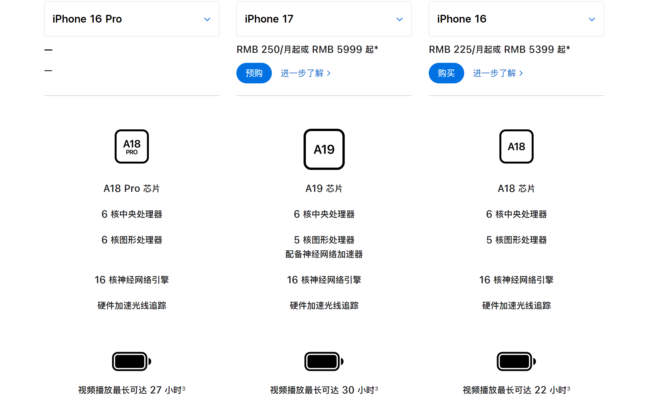 在核心处理器方面,iPhone 17 搭载的是全新的 A19 芯片,而 iPhone 16 Pro 搭载的是 A18 Pro 处理器。这两颗处理器的性能表现其实旗鼓相当,但由于 iPhone 17 采用了更先进的技术,使得它的单核性能可以和 A18 Pro 一较高下