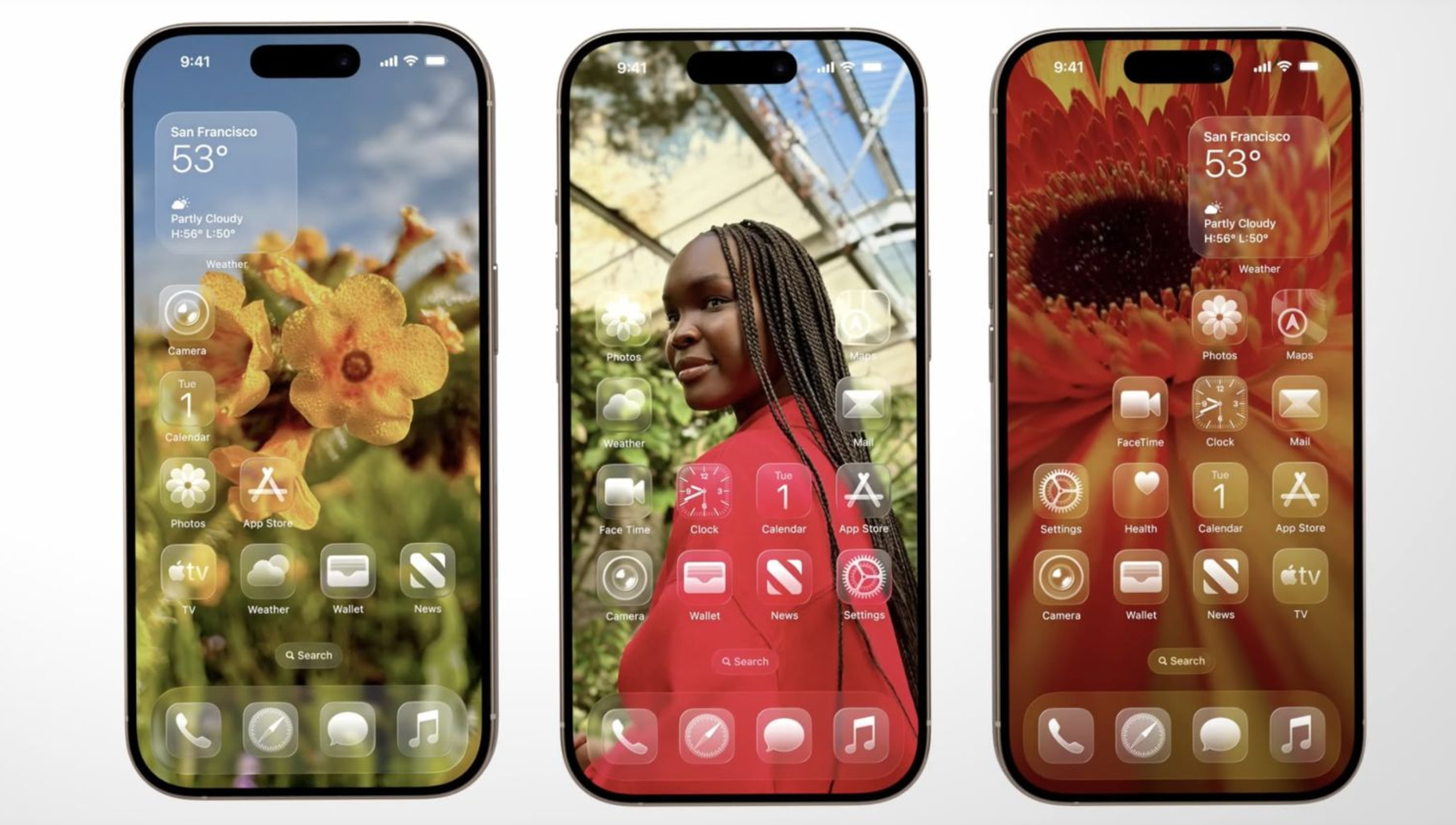 图标、菜单、通知栏、控制中心等界面元素仿佛漂浮在一层玻璃之下,随着光影和背景的变化而呈现出不同的通透感