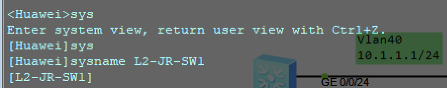 如果不重新命名的话,默认的名字会导致后面的配网工作混淆,导致不能顺利的理清思路,所以一般来说,会使用设备层次+设备名称+编号来命名,这里我将会使用L2-JR-SW1来去命名这台交换机,后面的设备也是同理