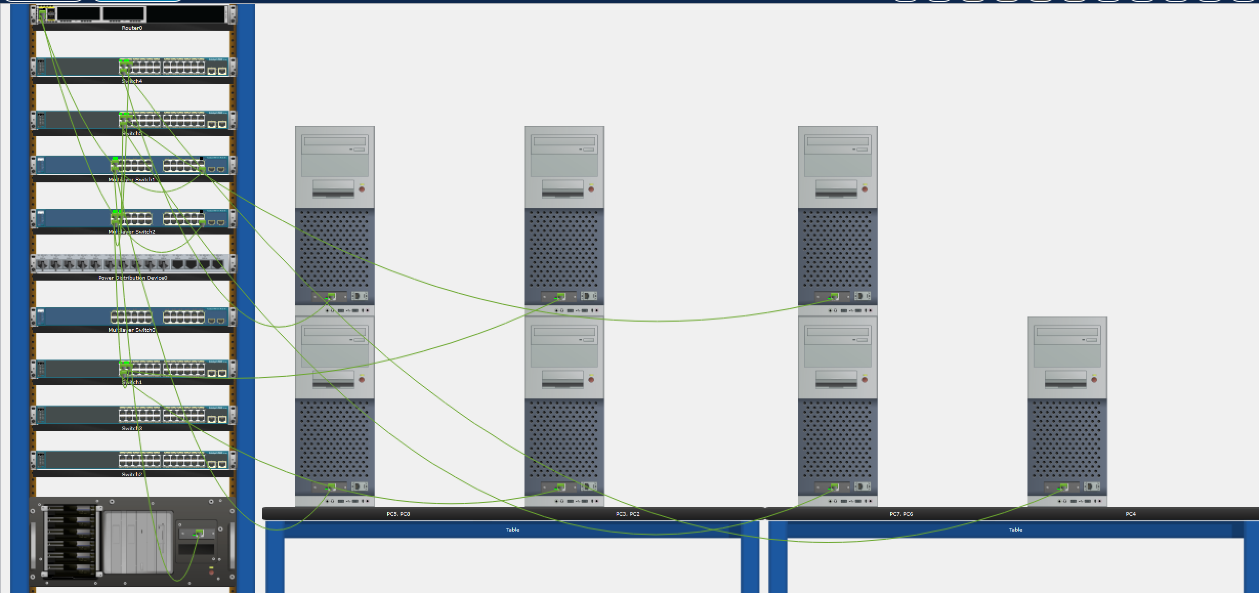 网络拓扑图分析:现将PC2-3,PC4-5,PC6-7&Client-1,划分成3个不同的vlan,代表着3中不同的网络环境,统一使用2层交换机来管理,并且最终将会汇聚到一个三层交换机中,使得可以连接路由器去访问在vlan100和vlan110下的网络,真实环境的效果图如下(使用思科模拟搭建模拟)