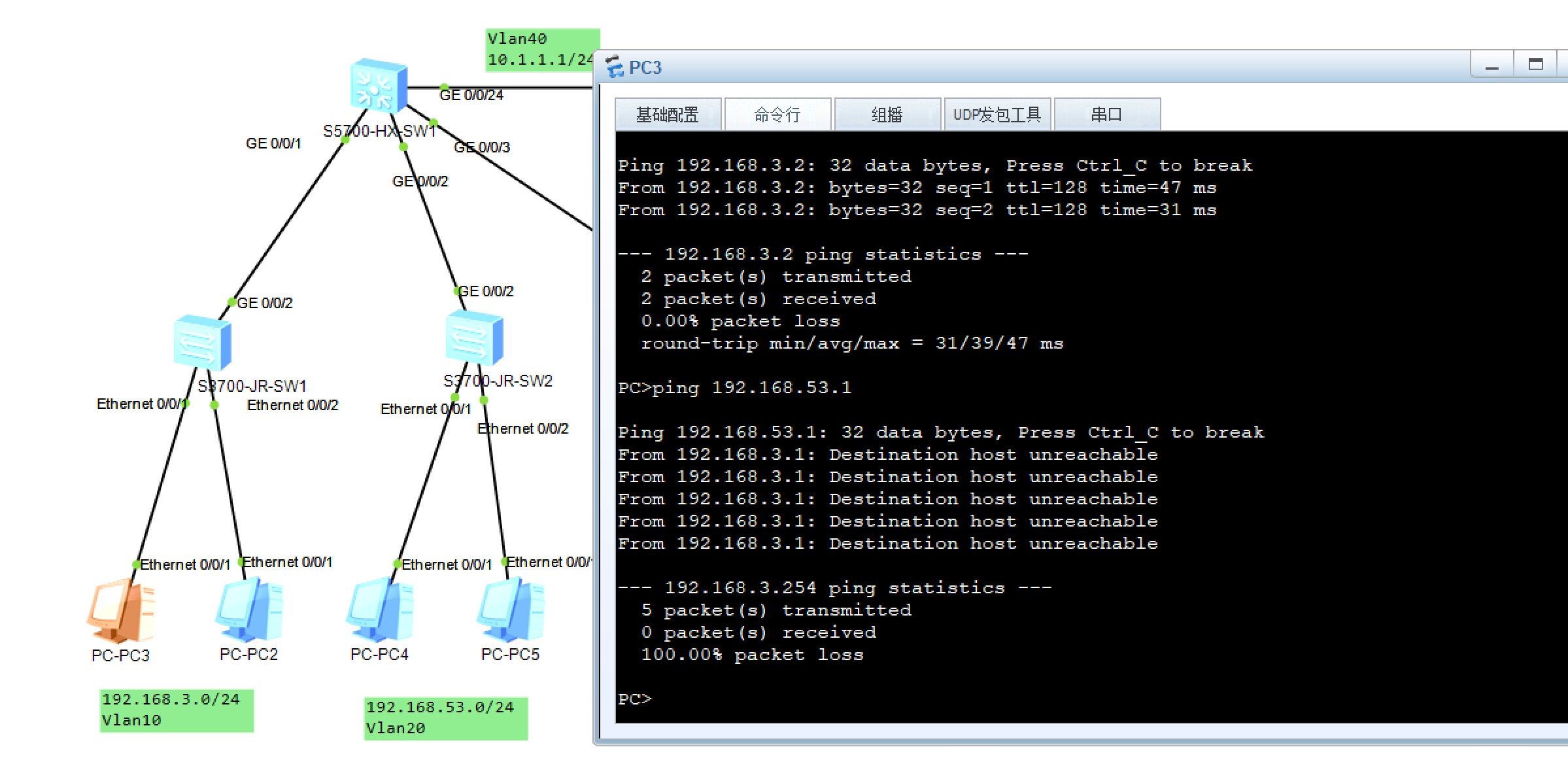 成功过后可以看到,在同一vlan下的PC相互能够成功通讯,而不在同一vlan下的PC相互不可通讯