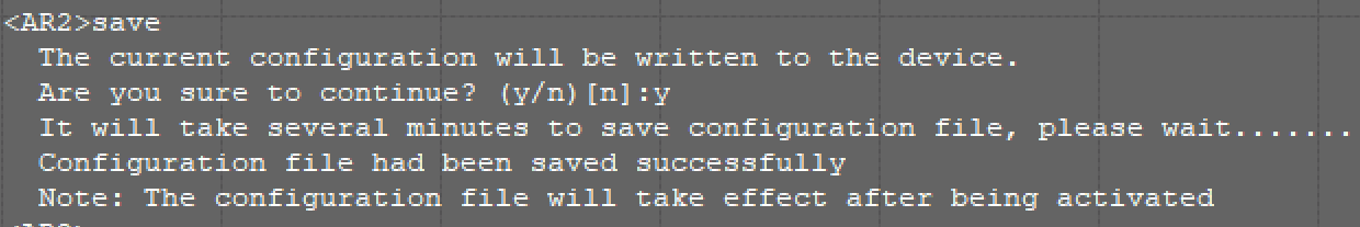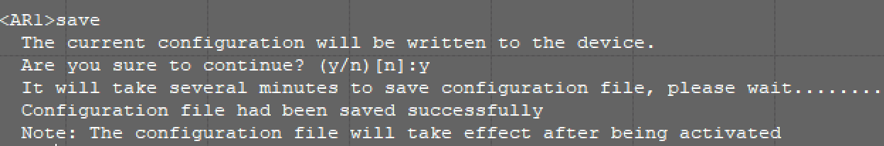 此外,退出特权模式(就是[huawei]的这个),进入用户模式下(就是<huuawei>的这个),输入save,再按照提示输入y,可以随时保存(此操作强烈建议经常做,如遇到ensp模拟器死机的时候,重启设备的时候,保存前的信息不会丢)