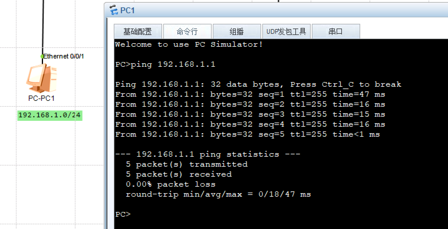 尝试Ping一下PC1的IP,当然也可以Ping通