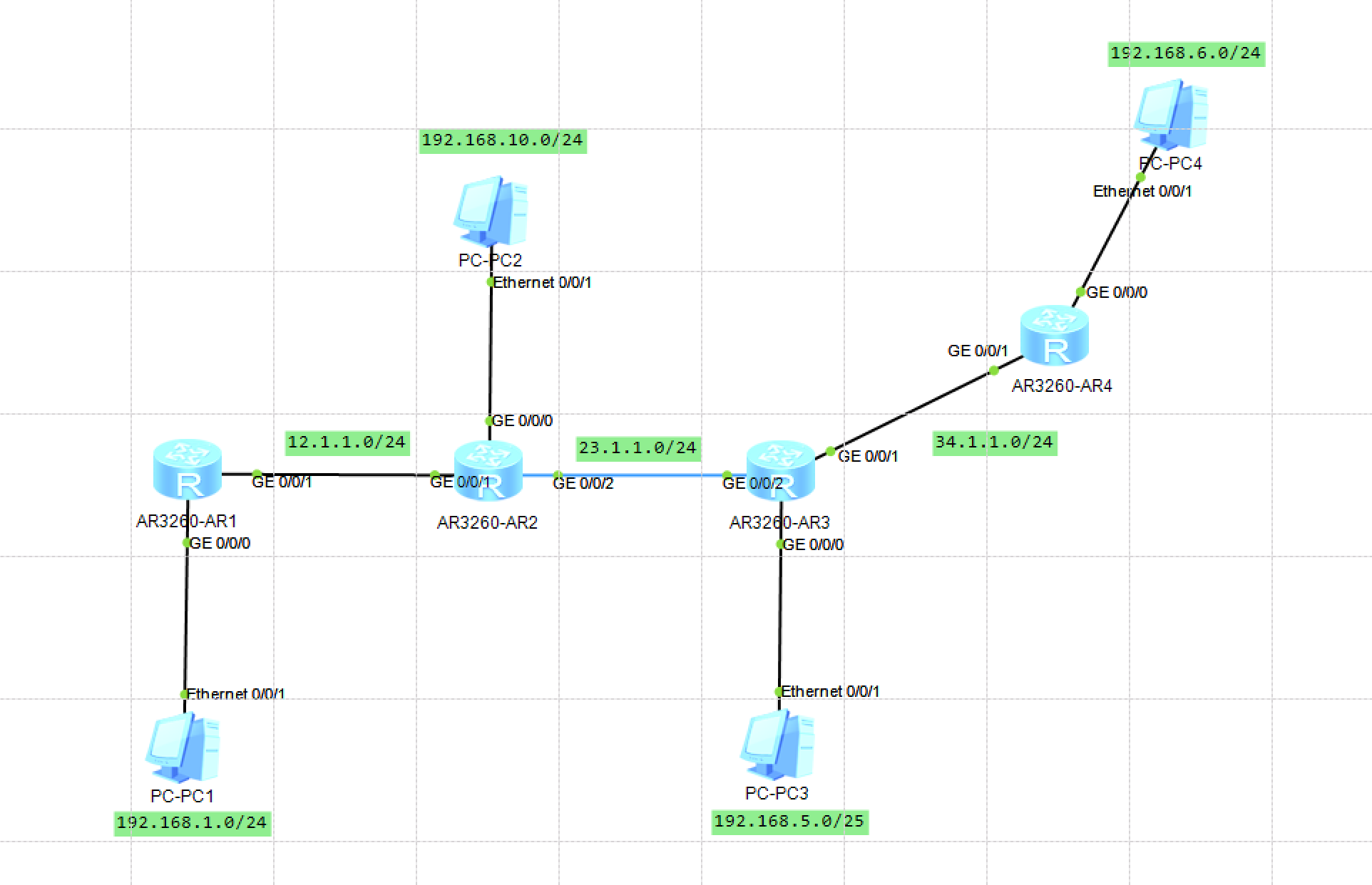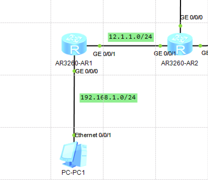 例如:我需要给PC1配网关的IP,那么我需要先进入上层的AR1与PC1连接的GE0/0/0口配IP,而这个IP就是PC1的网关IP