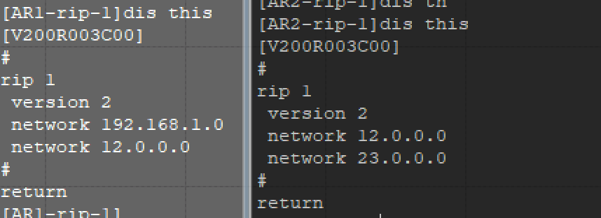 //宣告网段*注:这里RIP版本的原因,使用的是有类别路由协议,它的路由更新报文里不带子网掩码,只能按主类网络来发布路由信息,所以配置时得用12.0.0.0而非12.1.1.0,但效果都一样