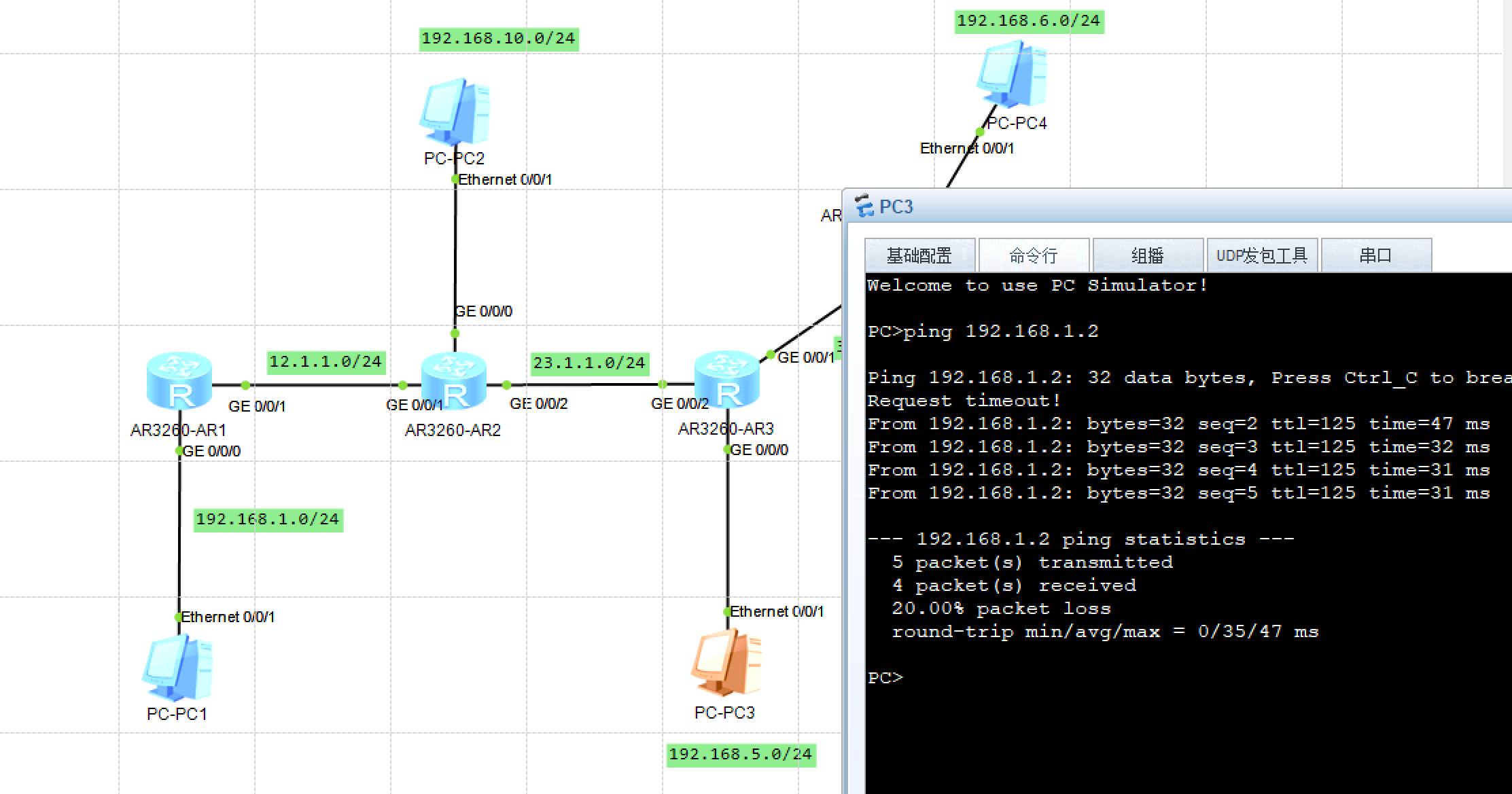 如果在此基础之上,直接使用PC5去Ping PC1你会发现这根本Ping不通