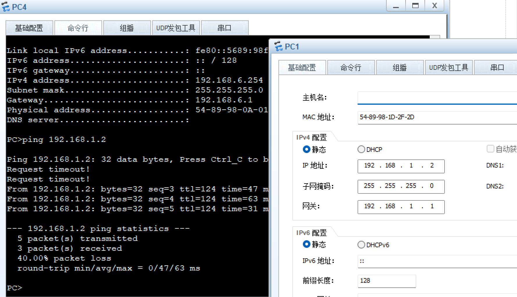 我们来使用PC4去Ping PC1验证一下: