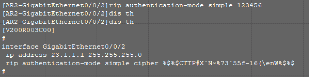 [AR2-GigabitEthernet0/0/2]rip authentication-mode simple cipher 123456