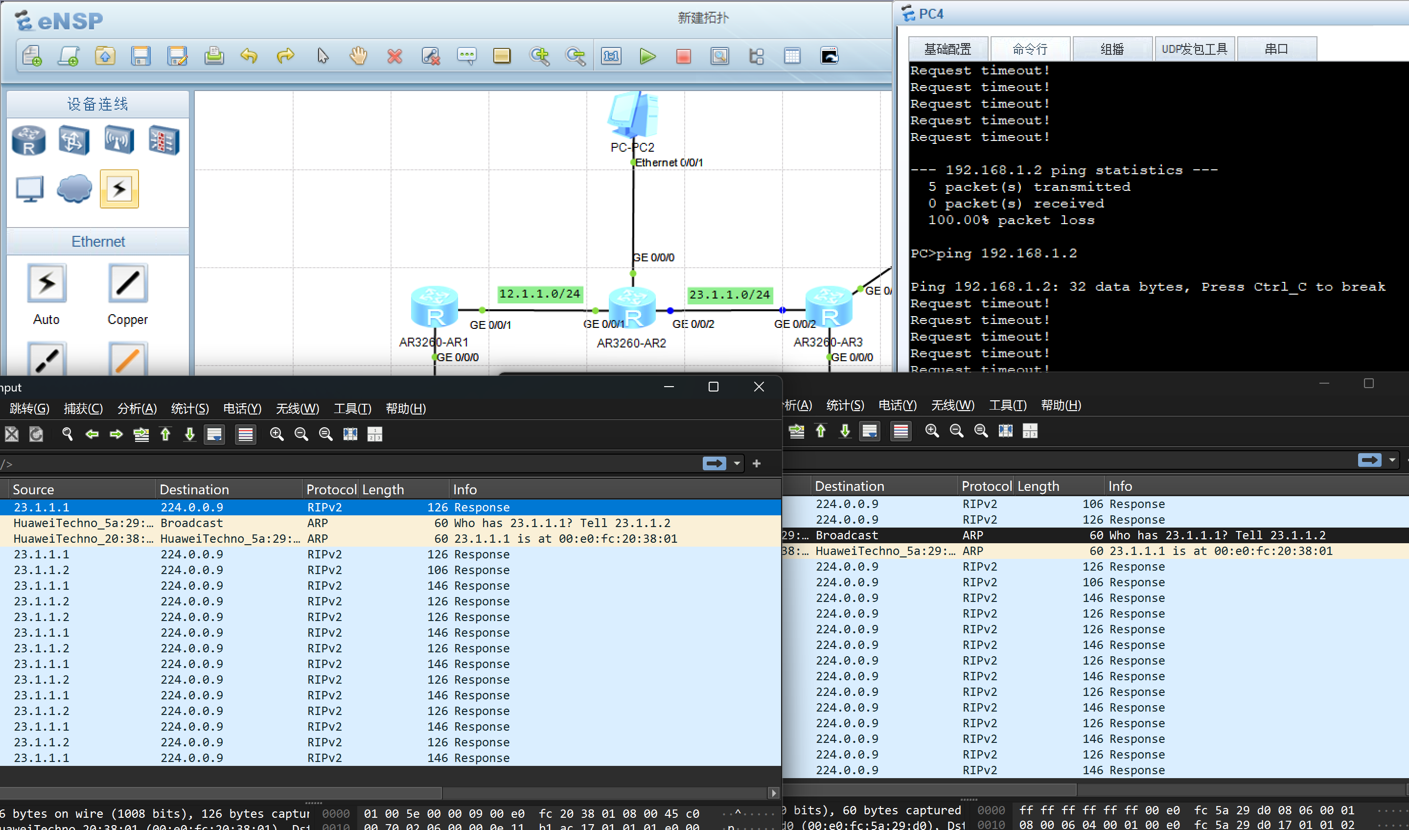 我设置了AR2的g0/0/2口的这个Rip密码,但是AR3的g0/0/2没设置,现在我用这个PC4pingPC1,并在AR2和AR3的这两个g0/0/2口抓的包