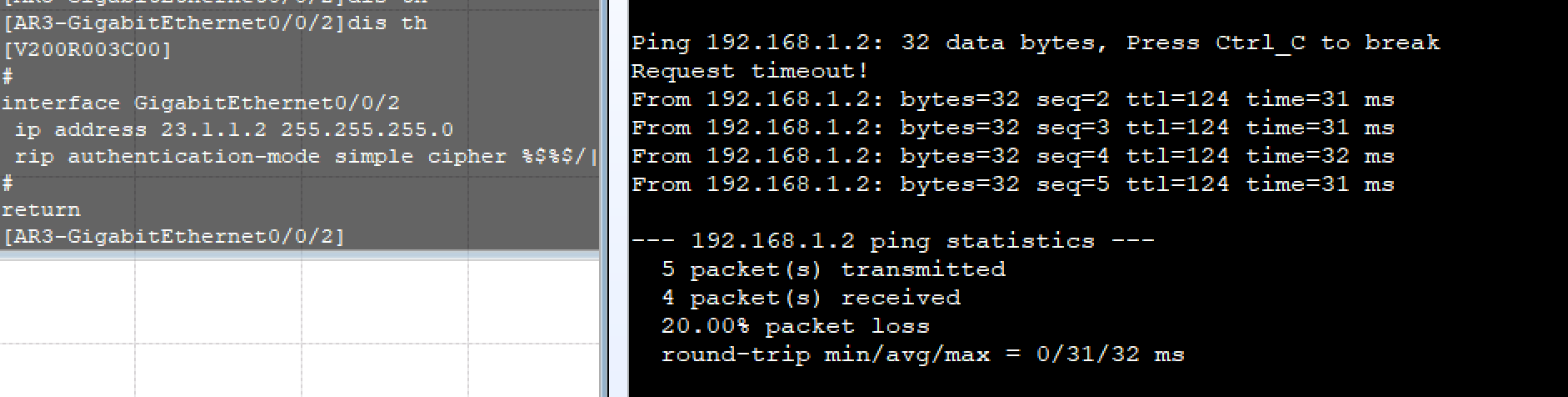 可以看到并没有Ping成功,代表着被Rip的密码给拦截了