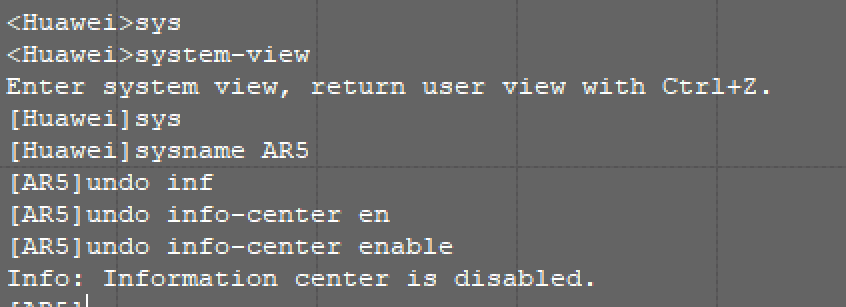 开始之前,可以输入sys(等同于system-view,为了方便,以下我将会使用sys这个简化后的指令来操作),进入特权模式(就是[huawei]的这个)输入以下指令,从而关闭烦人的操作日志: