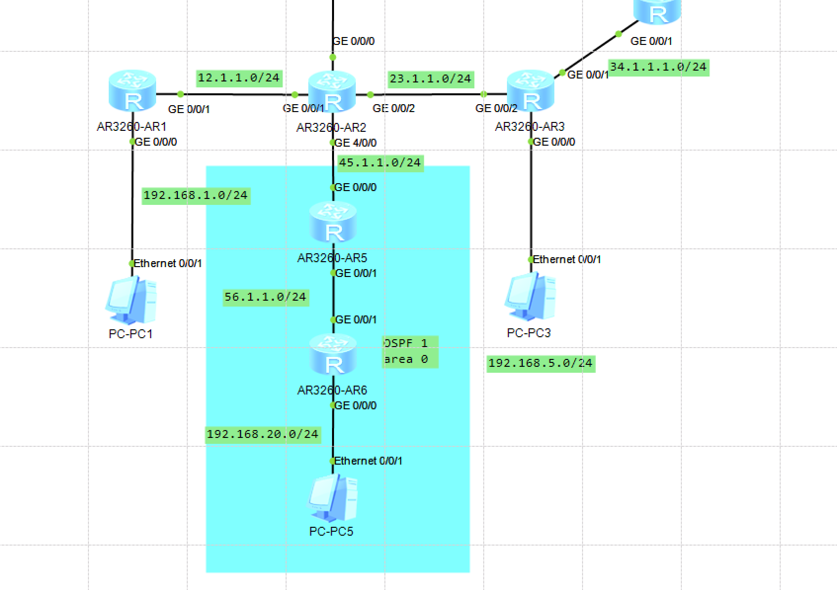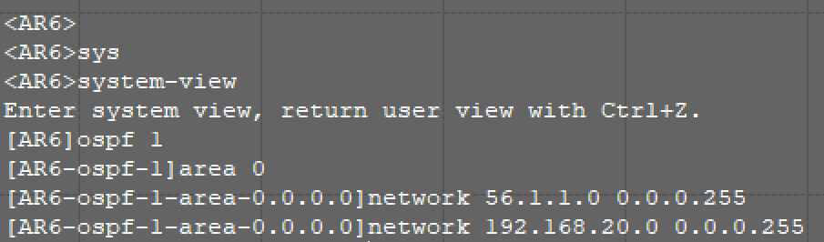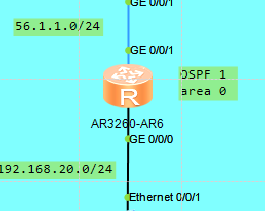 给这个新添加的两个网段(AR2和AR5我设置的是45.1.1.0/24网段,AR5和AR6我设置的56.1.1.0/24网段,AR6和PC5我设置的192.168.20.0/24网段)并且在这个我使用颜色框选的这个区域配置OSPF路由,使得在我所框选的区域内,可以实现设备互通