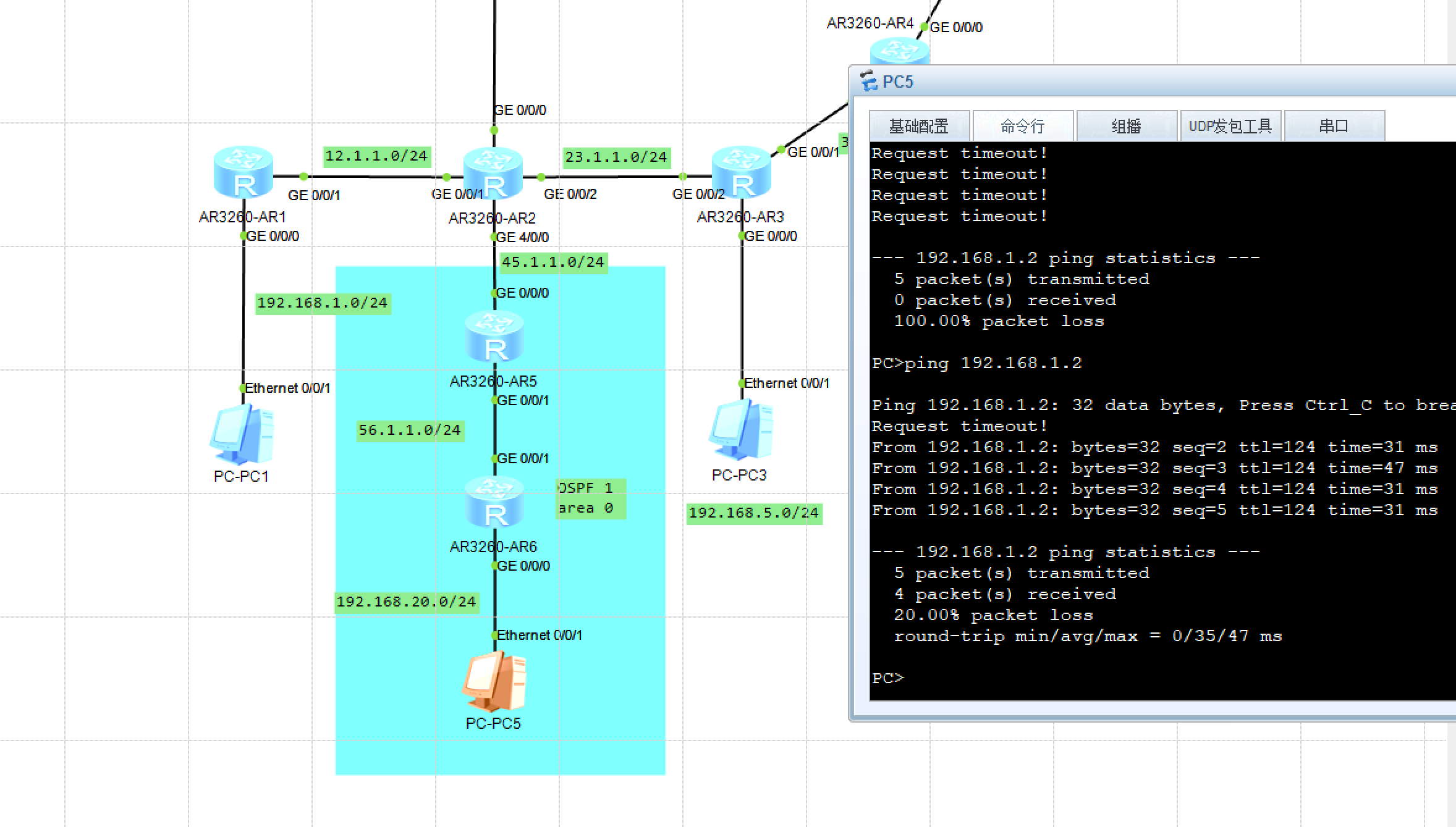 验证配置:(我这里使用PC5和AR6,去PingGE0/0/0口的45.1.1.2,发现可以Ping通,则代表已经实现配置的OSPF的网络全部连通)